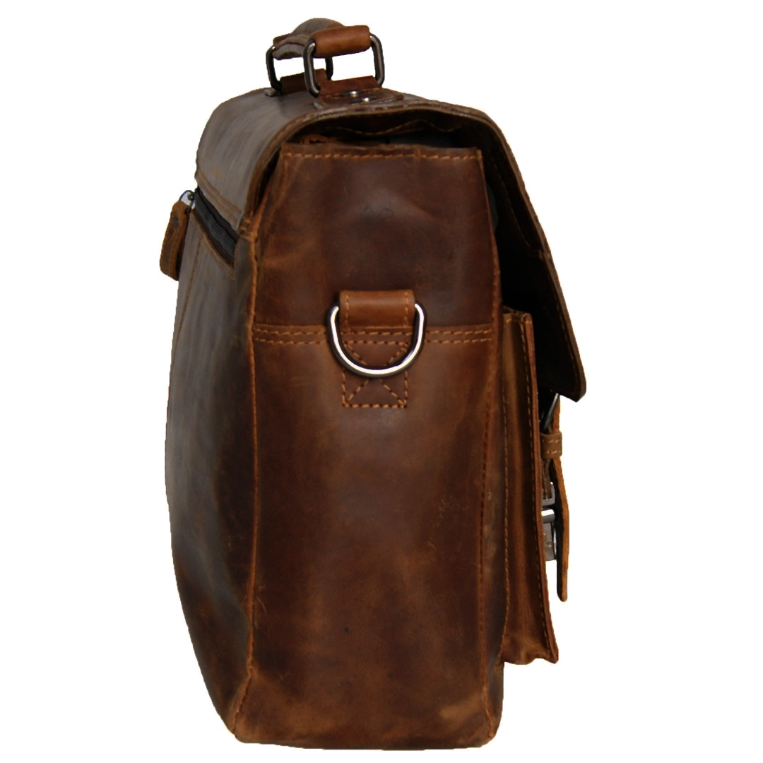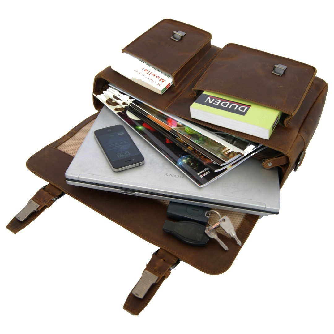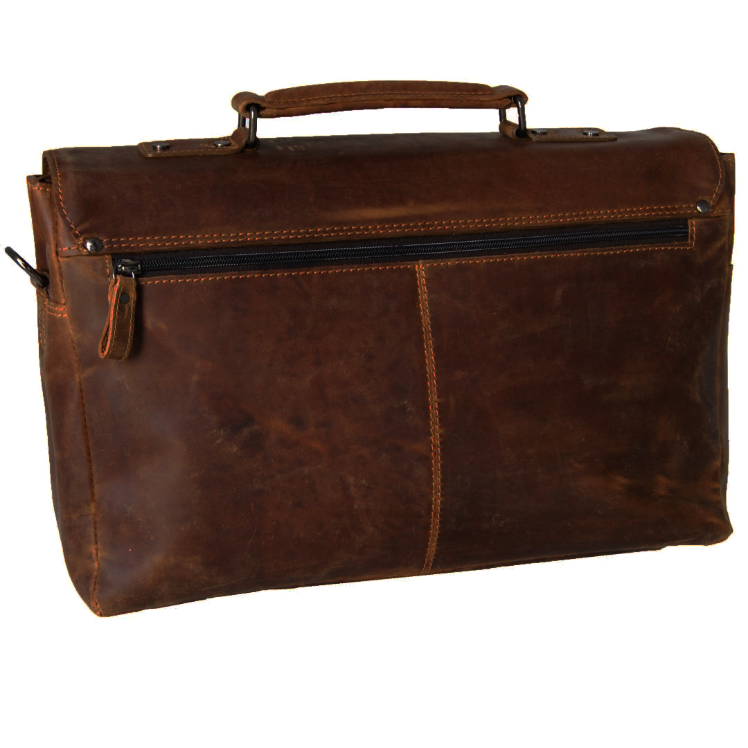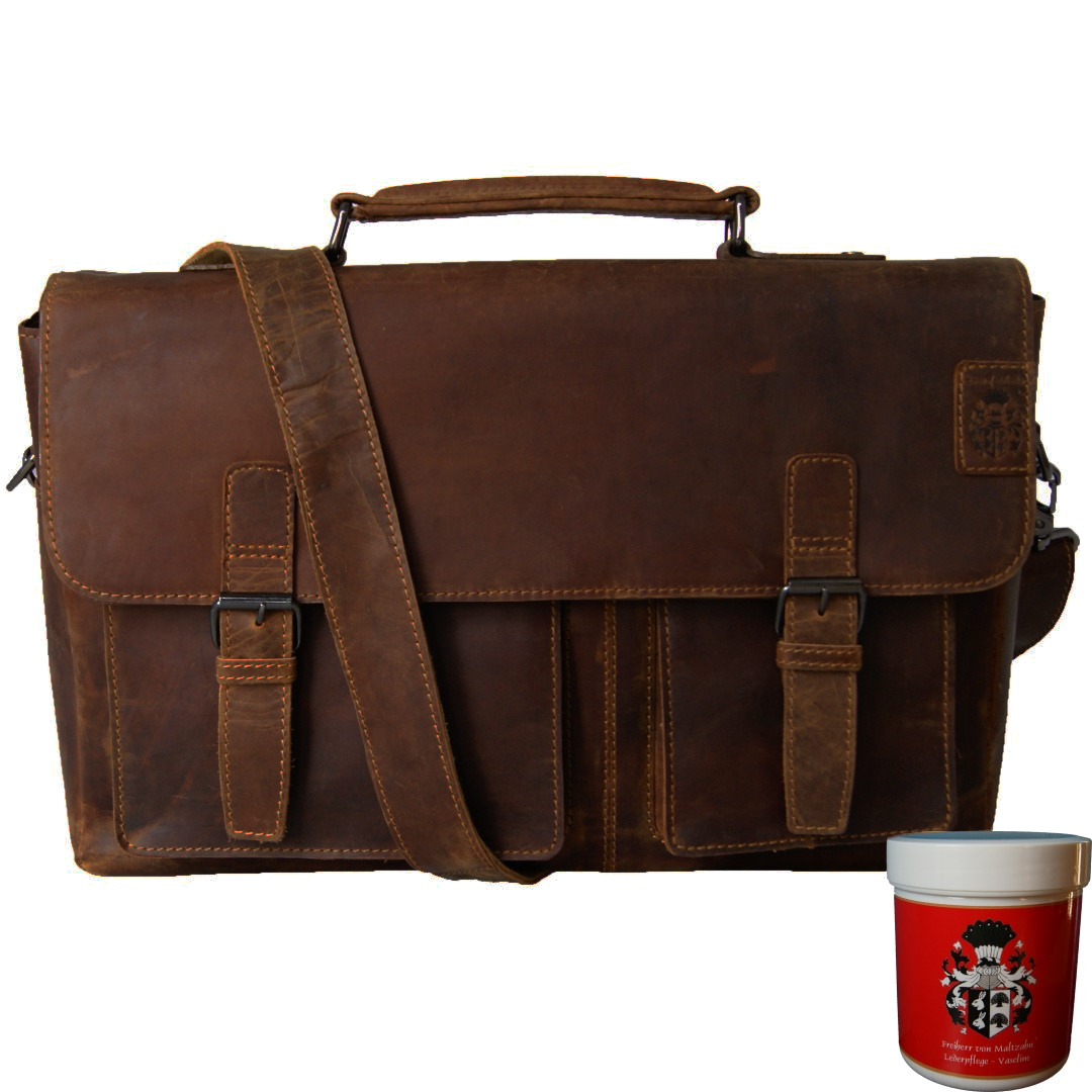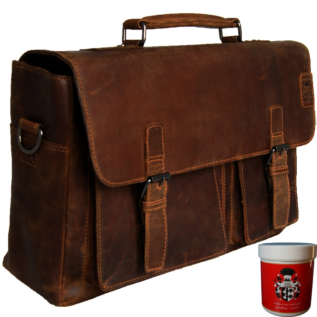 Diese braune Aktentasche ist aus hochwertigem Vollrindleder gefertigt.