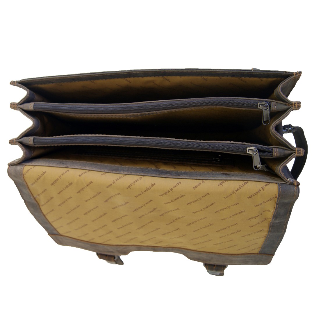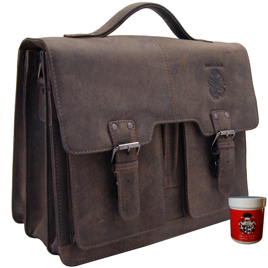 Diese Aktentasche überzeugt durch die exzellente Verarbeitung und klassischem Design. Sie ist aus 2,7 mm starkem Leder gefertigt und mit extra festem Garn vernäht. Der gefütterte Überschlag wird durch Schnappverschlüsse aus hochwertigem Edelstahl perfekt verschlossen. Diese Aktentasche ist ein Unikat in zeitlosem Design.