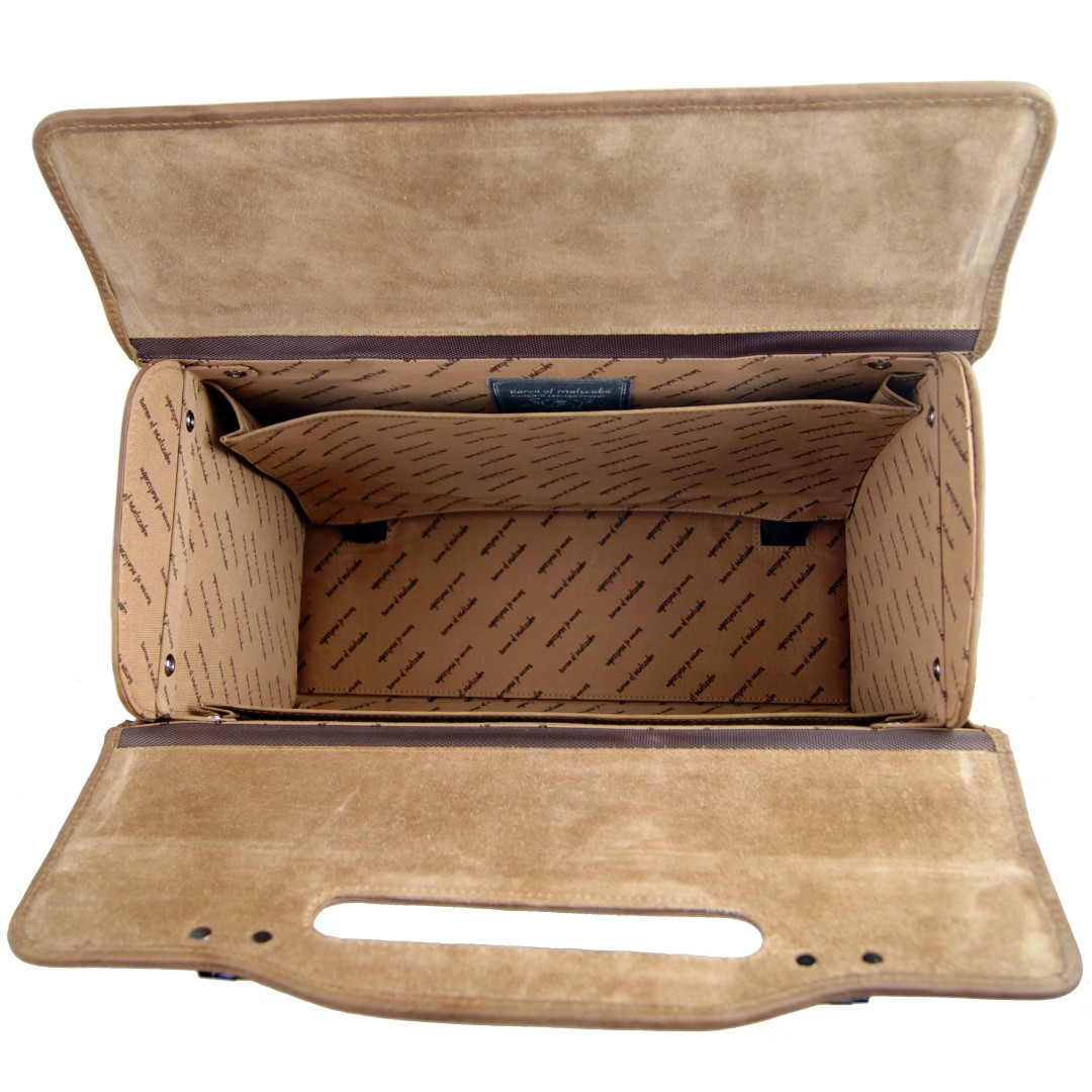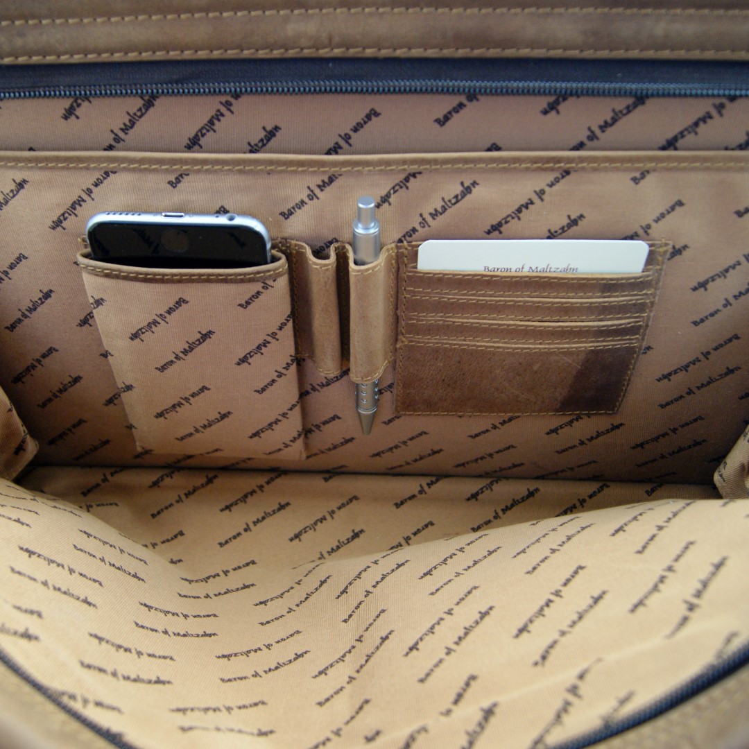 Im Inneren ist der Pilotenkoffer gefüttert und verfügt über ein großes Hauptfach, das Platz für zwei Ordner bietet. Außerdem ist der Trolley mit Fächern für Ihren Laptop, Ihr Smartphone, Dokumente, Karten, Schreibgeräte und weitere Utensilien ausgestattet.