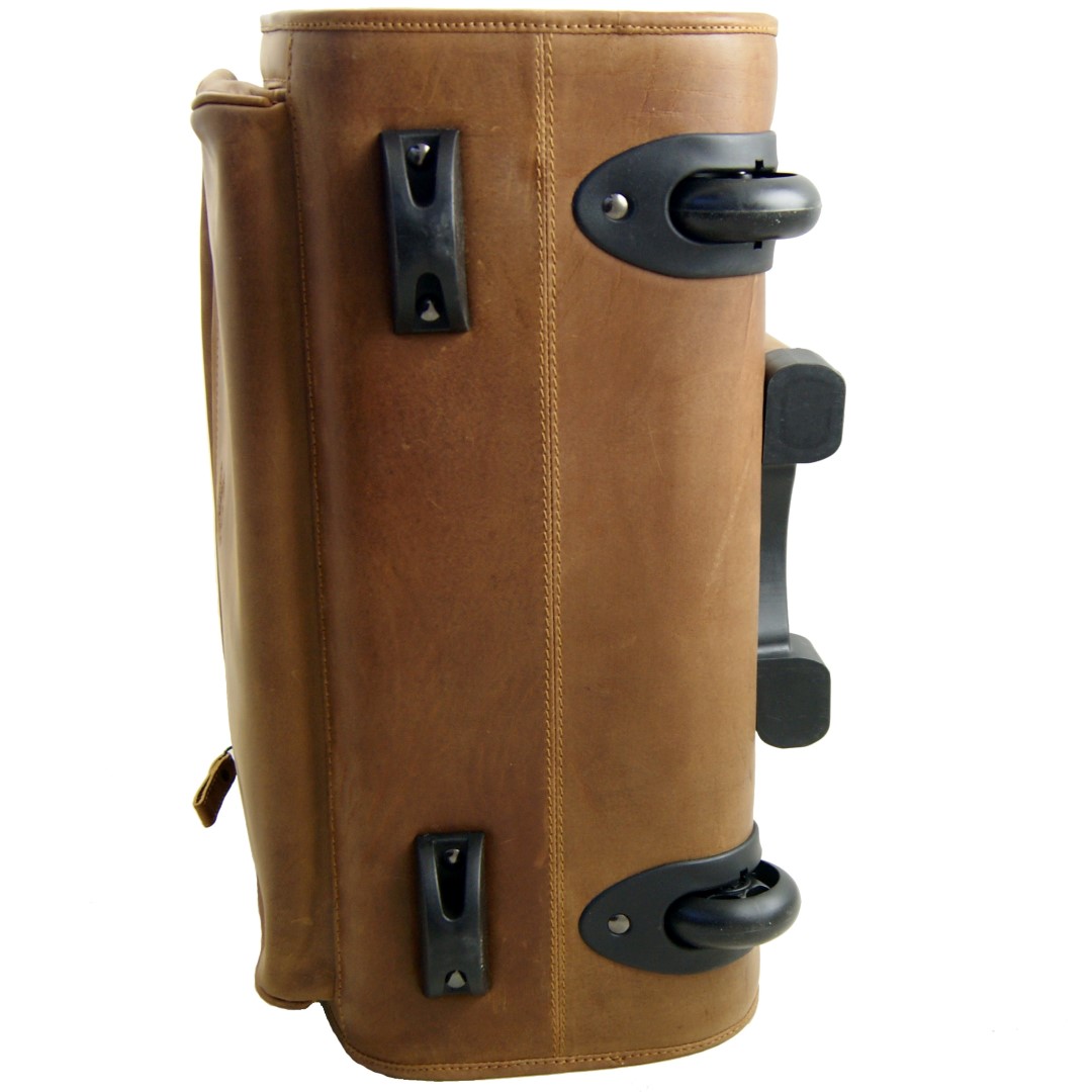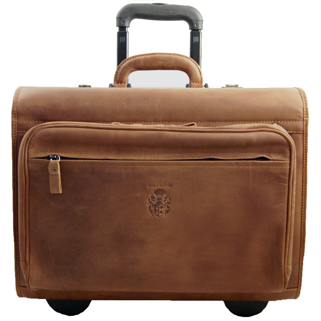 Außerdem kann der Pilotenkoffer mit seinem bequem gestalteten Griff auch optimal in der Hand getragen werden. Auffallend an diesem hochwertigen Trolley ist auch sein exklusives Design aus edlem Leder in schöner Vintage-Gerbung.